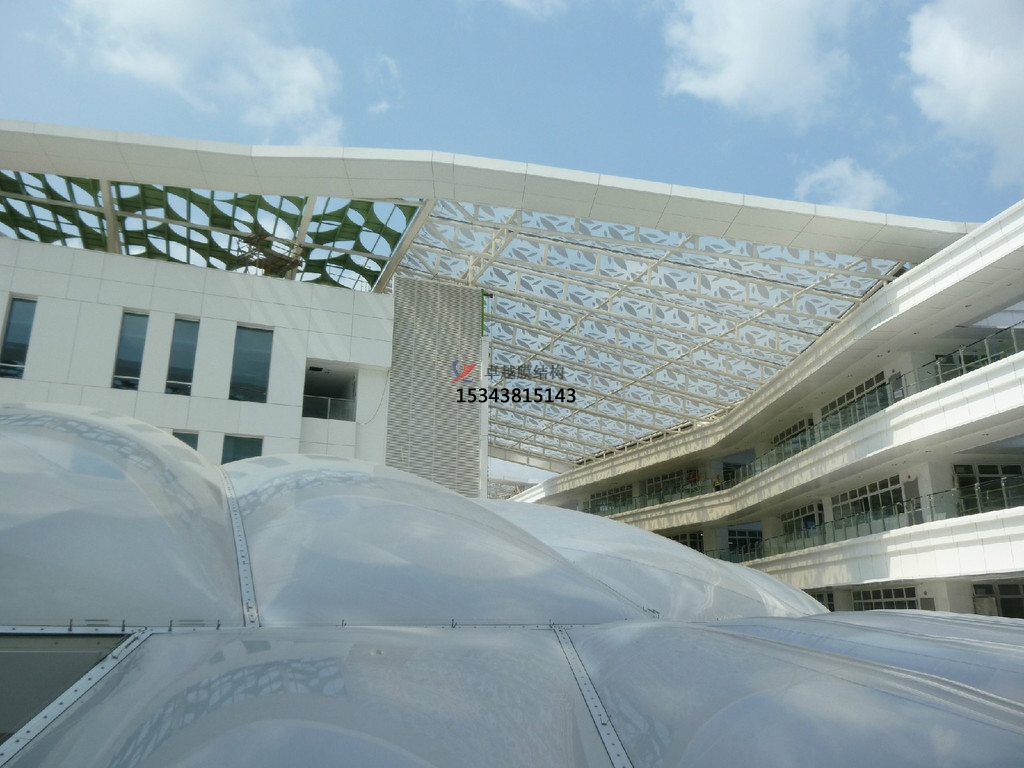 也不是所有的建筑都需要透明,或許只需要采光好半透明這種材料就可以滿足了,ETFE膜材就根據(jù)不同的建筑需求可以定制不同透光率的ETFE膜材料。無(wú)論你的設(shè)計(jì)需求是什么,我們中衛(wèi)ETFE膜結(jié)構(gòu)建筑的透光性可以滿足您對(duì)采光這方面的需求。