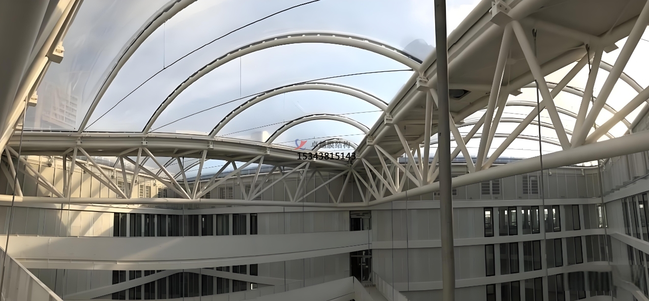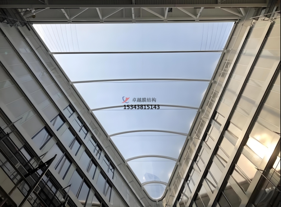 ETFE膜,更大的優(yōu)勢(shì)還在于它們可以加工成任何尺寸和形狀,滿足大跨度的需求,節(jié)省了中間支承結(jié)構(gòu)。作為一種充氣后使用的材料,它可以通過(guò)控制充氣量的多少,對(duì)遮光度和透光性進(jìn)行調(diào)節(jié),有效地利用自然光,節(jié)省能源,同時(shí)起到保溫隔熱作用。