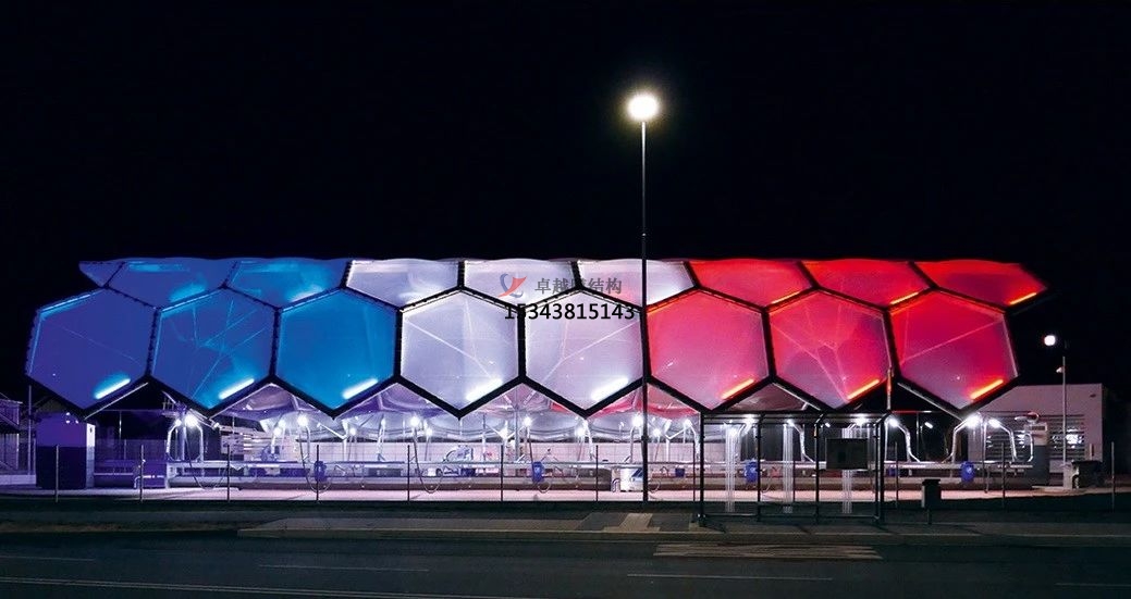 張拉膜結構可以根據(jù)需要制成任意復雜曲面形狀,體現(xiàn)自然流暢之美;并有多種顏色的膜材可選,以適應周邊的環(huán)境、滿足建筑效果要求;而且膜結構質量輕,一般不需要太龐大的支撐結構,這是其他建筑材料無法比擬的優(yōu)勢所在。