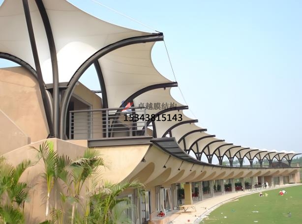 膜結(jié)構(gòu)的優(yōu)勢:造型自由,輕量化與大跨度,透光與節(jié)能,耐候性,自潔性。膜結(jié)構(gòu)的造型可設(shè)計(jì)為曲面、張拉式等復(fù)雜形態(tài),打破傳統(tǒng)建筑的死板,契合高爾夫球場的高端定位。膜材自重輕(如 PVDF、PTFE 膜材),無需大量梁柱支撐,實(shí)現(xiàn)無遮擋空間,施工便捷。膜結(jié)構(gòu)透光率可達(dá) 20%(如 PVDF 膜),引入自然光,減少照明能耗;高反射率膜材(如 ETFE)可降低室內(nèi)溫度。膜結(jié)構(gòu)具有抗紫外線、耐腐蝕,適應(yīng)海南等高溫高濕地區(qū),壽命可達(dá) 15-30 年(PTFE 膜材耐久性更佳)。膜結(jié)構(gòu)具有自潔性,ETFE、PTFE 膜材表面光滑,灰塵易被雨水沖刷,維護(hù)成本低。