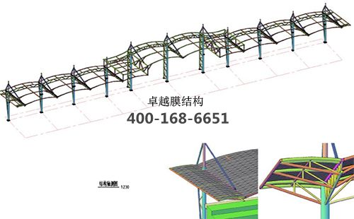 本工程膜材采用白色高端國(guó)產(chǎn)膜材PVDF高自潔環(huán)保建筑膜材,鋼結(jié)構(gòu)采用更好的標(biāo)準(zhǔn)Q235B鋼材,表面采用酚醛底漆處理,面漆采用白色鋼結(jié)構(gòu)專用快干磁漆。