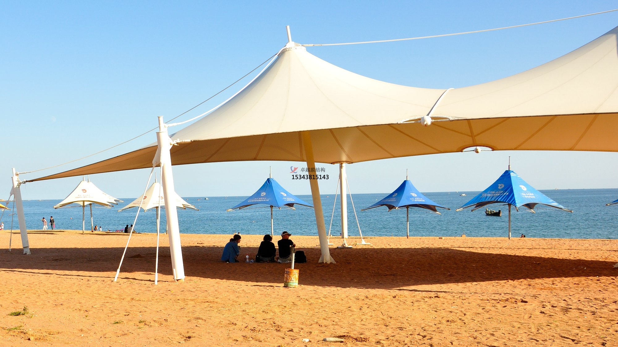 天津保稅區(qū)區(qū)標(biāo)。已經(jīng)成為中國(guó)膜結(jié)構(gòu)業(yè)界的里程碑,它標(biāo)志著中國(guó)膜結(jié)構(gòu)劃時(shí)代的開始,其中索膜結(jié)構(gòu)是此工程的重點(diǎn)內(nèi)容,44個(gè)獨(dú)立的膜結(jié)構(gòu)單元體和鋼結(jié)構(gòu)采用牽拉方式連接,面材為法國(guó)法拉利公司生產(chǎn)的型號(hào)為1002T。