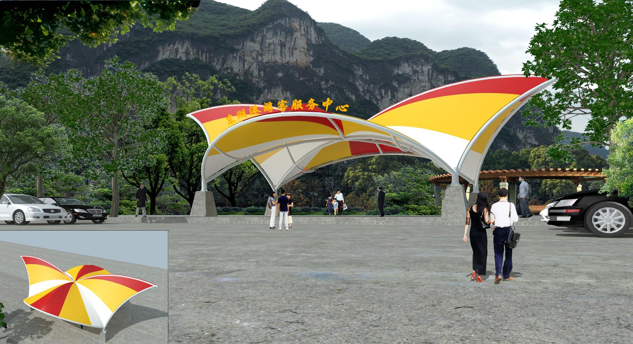 (3)經(jīng)濟(jì)性。膜材料具有一定的透光率,白天可減少照明強(qiáng)度和時(shí)間,節(jié)約能源;夜間彩燈透射可形成絢爛的景觀。而且,景觀膜結(jié)構(gòu)遮陽棚能夠拆卸,易于搬遷,特別是在建造短期應(yīng)用的大跨度建筑時(shí),更為經(jīng)濟(jì)。
