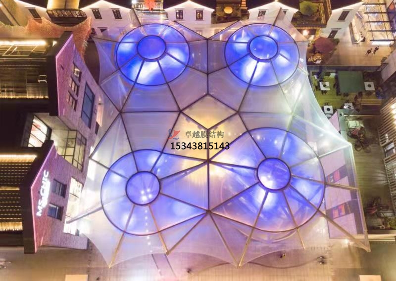 膜結(jié)構(gòu)以高強(qiáng)度柔性薄膜(如ETFE、PVDF)為核心材料,結(jié)合鋼索、桁架等支撐體系,形成兼具輕量化與高穩(wěn)定性的空間曲面12。其自重僅為傳統(tǒng)鋼構(gòu)的1/3,大幅降低基礎(chǔ)造價(jià),同時(shí)支持50米以上無柱大跨度設(shè)計(jì),為商業(yè)廣場創(chuàng)造開闊通透的公共空間。ETFE氣枕膜通過多層鍍點(diǎn)設(shè)計(jì),可智能調(diào)節(jié)透光率與紫外線過濾效率,例如嘉興長安里商業(yè)街的天幕結(jié)構(gòu),既能實(shí)現(xiàn)光線漫射營造柔和氛圍,又能有效阻隔70%以上的紫外線輻射。