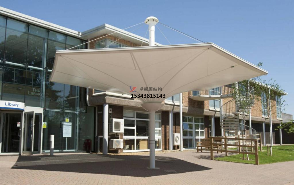 (4) 保護性。膜材料具有阻燃性和耐抗溫性,能達到防火要求;景觀膜結構遮陽棚為柔性結構,能承受大位移,整體不易倒塌;景觀膜結構遮陽棚重量輕,抗震性能比較好。