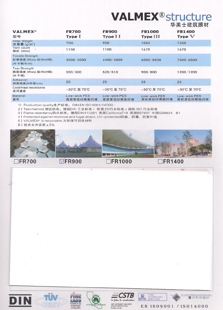 德國米樂膜材的獨(dú)特性能:雙面PVDF自潔涂層-不僅對(duì)膜材頂面有更好的的保護(hù)作用,而且對(duì)底面也有優(yōu)良的保護(hù)作用。完全消除了僅有一面PVDF涂層的膜材缺點(diǎn),和因此而帶來的工程隱患。使其更加適合品質(zhì)要求較高的大型、永久性、標(biāo)志性建筑。