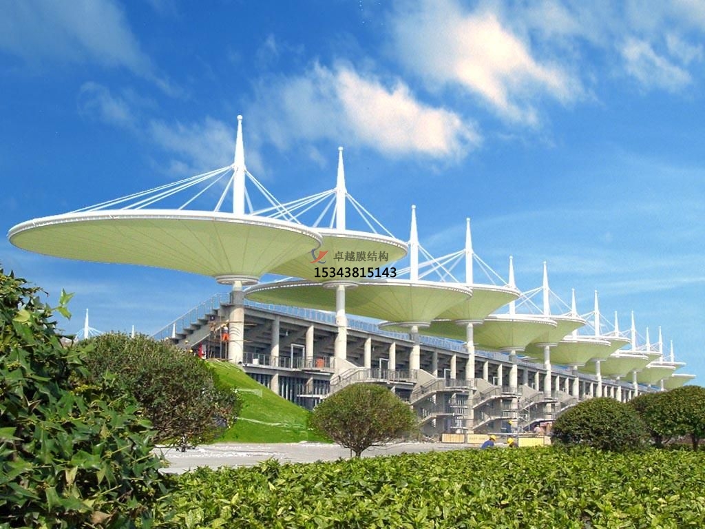 張拉膜看臺(tái)主要用于各類地方體育場(chǎng)主席臺(tái)雨棚,各類學(xué)校體育場(chǎng)看臺(tái)雨棚遮蓋,我公司是國內(nèi)較早從事大懸挑張拉膜結(jié)構(gòu)看臺(tái)設(shè)計(jì)施工的專業(yè)廠家,下面介紹一下我們?cè)谟乐菔兄苓吙h市完工的一些張拉膜看臺(tái)設(shè)計(jì)施工案例,我公司先后在郴州市周邊承接了永州職業(yè)技術(shù)學(xué)院看臺(tái)雨棚、郴州市工業(yè)交通學(xué)??磁_(tái)罩棚、湖南郴州明星學(xué)校張拉膜看臺(tái)遮陽棚張拉膜看臺(tái)遮陽棚等設(shè)計(jì)施工項(xiàng)目,簡(jiǎn)介如下:
