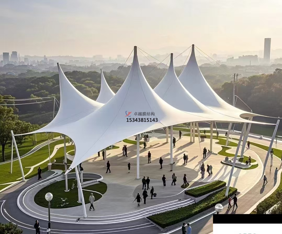 景觀膜結構的核心在于其采用的薄膜材料。這些材料具有高強度、輕質、透光性好、耐候性強等顯著特點,使得膜結構建筑能夠展現(xiàn)出輕盈靈動的姿態(tài),與自然環(huán)境和諧共生1。通過精細的裁剪、焊接和涂裝等工藝流程,設計師們將這些薄膜材料轉化為一道道亮麗的風景線,為城市空間增添了無限的藝術氣息。