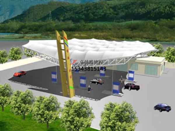 更后加氣站雨棚施工是由多種高強(qiáng)薄膜材料(PVC或Teflon)及加強(qiáng)構(gòu)件(鋼架、鋼柱或鋼索)通過一定方式使其內(nèi)部產(chǎn)生一定的預(yù)張應(yīng)力以形成某種空間形狀,作為覆蓋結(jié)構(gòu),并能承受一定的外荷載作用的一種空間結(jié)構(gòu)形式。結(jié)構(gòu)車棚的篷布材質(zhì)是膜結(jié)構(gòu),而膜材的更大特點(diǎn)是強(qiáng)度高、耐久性好、防火難燃、自潔性好,不受紫外線影響,使用壽命長,一般15-30年。具有高透光率,透光率為13%,對熱能反射率73%,熱吸收量很少。正是因?yàn)檫@種劃時代的膜材料的發(fā)明,使加氣站雨棚施工成為現(xiàn)代化的永久建筑。
