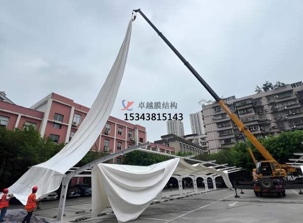 安裝過程:安裝過程分別是鋼結(jié)構(gòu)的安裝,膜材的安裝和附件安裝。鋼結(jié)構(gòu)的安裝會根據(jù)設(shè)計(jì)要求進(jìn)行鋼結(jié)構(gòu)基礎(chǔ)的施工,確?;A(chǔ)的尺寸、位置、標(biāo)高符合設(shè)計(jì)要求,做到表面光滑、無變形、無損傷。鋼結(jié)構(gòu)的安裝位置必須準(zhǔn)確,將鋼結(jié)構(gòu)構(gòu)件在地面進(jìn)行預(yù)組裝,檢查各構(gòu)件的連接是否準(zhǔn)確、牢固,使用專業(yè)的吊裝設(shè)備,如起重機(jī)等,按照預(yù)定的吊裝方案進(jìn)行操作,確保鋼結(jié)構(gòu)的安裝位置準(zhǔn)確。要隨時(shí)進(jìn)行測量和調(diào)整,保證鋼結(jié)構(gòu)的垂直度、水平度和跨度等符合設(shè)計(jì)要求。采用焊接、螺栓連接等方式將鋼結(jié)構(gòu)構(gòu)件連接固定,確保連接的強(qiáng)度和可靠性。焊接時(shí),要嚴(yán)格控制焊接質(zhì)量,避免出現(xiàn)焊接缺陷。膜材的安裝過程,膜面的尺寸和形狀必須符合設(shè)計(jì)要求,表面干凈、無損傷。膜材在安裝現(xiàn)場按照預(yù)定的方向和位置展開,同時(shí)應(yīng)注意避免膜材與地面或其他物體摩擦、劃傷。使用專用的夾具或繩索將膜材固定在鋼結(jié)構(gòu)上,初步調(diào)整膜材的位置,使其與鋼結(jié)構(gòu)的連接點(diǎn)對齊。進(jìn)行逐步且均衡的膜面張拉,張拉過程要均勻、緩慢地進(jìn)行,施加適當(dāng)?shù)念A(yù)張力,同時(shí)要根據(jù)膜材的實(shí)際情況,對張拉力進(jìn)行適當(dāng)?shù)恼{(diào)整,保證膜材表面平整、光滑,無褶皺、松弛等現(xiàn)象,使其達(dá)到設(shè)計(jì)要求。在膜材張拉到位后,使用專用的固定件將膜材牢固地固定在鋼結(jié)構(gòu)上。固定件的間距和安裝方式要符合設(shè)計(jì)要求,確保膜材在使用過程中不會出現(xiàn)松動或位移。附件安裝,附件的安裝包括排水系統(tǒng)安裝,遮陽設(shè)施安裝和安全設(shè)施安裝。安裝膜結(jié)構(gòu)的排水槽、落水口等排水設(shè)施,確保雨水能夠順利排出,避免在膜面形成積水。排水系統(tǒng)的安裝要保證密封性和排水順暢性。如果膜結(jié)構(gòu)設(shè)計(jì)有遮陽要求,安裝相應(yīng)的遮陽簾、遮陽網(wǎng)等遮陽設(shè)施。遮陽設(shè)施的安裝要牢固可靠,能夠滿足遮陽和使用功能的要求。安裝必要的安全設(shè)施,如欄桿、安全網(wǎng)等,確保人員在膜結(jié)構(gòu)區(qū)域內(nèi)的安全。