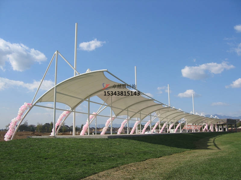 膜結(jié)構(gòu)是一種建筑與結(jié)構(gòu)完美結(jié)合的結(jié)構(gòu)體系。它是用高強度柔性薄膜材料與支撐體系相結(jié)合形成具有一定剛度的穩(wěn)定曲面,能承受一定外荷載的空間結(jié)構(gòu)形式。其造型自由輕巧、阻燃、制作簡易、安裝快捷、節(jié)能、易于、使用安全等優(yōu)點,因而使它在世界各地受到廣泛應(yīng)用。這種結(jié)構(gòu)形式特別適用于大型體育場館、人口廊道、小品、公眾休閑娛樂廣場、展覽會場、購物中心等領(lǐng)域。