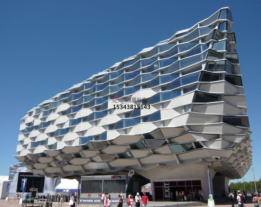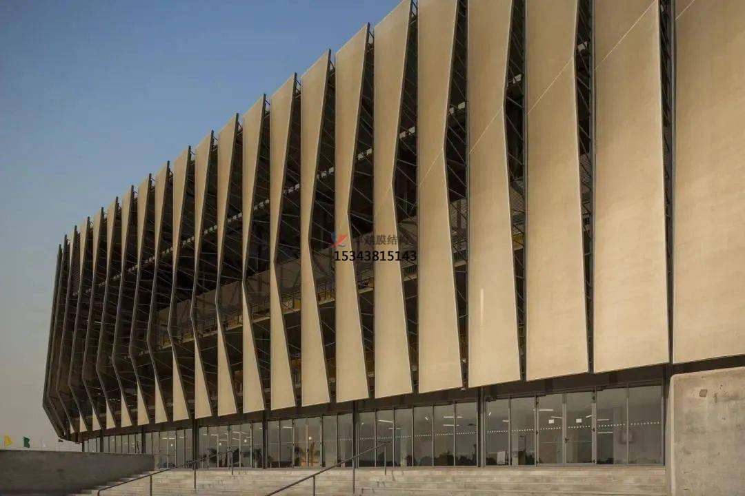 膜結(jié)構(gòu)幕墻是膜結(jié)構(gòu)在建筑外圍護(hù)結(jié)構(gòu)的應(yīng)用,以耐候性的柔性織物作為圍護(hù)材料,結(jié)合框架系統(tǒng),對既有建筑的外立面進(jìn)行翻新改造或新建筑外立面設(shè)計(jì)應(yīng)用的一種建筑外立面解決方案。膜結(jié)構(gòu)充滿張力且富于變化的曲面,自在靈敏的大空間、透明半透明膜材所構(gòu)成的明亮而又溫和的室內(nèi)環(huán)境,桅桿、拉索、精致的金屬節(jié)點(diǎn)等所表現(xiàn)的富有現(xiàn)代氣息的結(jié)構(gòu)技術(shù),給人們提供了有別于傳統(tǒng)幕墻結(jié)構(gòu)的全新視覺感受,它具有環(huán)保節(jié)能、可100%回收再利用、施工方便、重量輕、高強(qiáng)、高彈、高透光性、柔軟流暢、造型美觀、結(jié)構(gòu)固定簡單等特點(diǎn)。