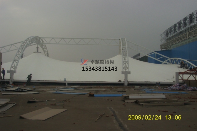 膜結構是一種建筑與結構結合的結構體系,是采用高強度柔性薄膜材料與輔助結構通過一定方式使其內部產生一定的預張應力,并形成應力控制下的某種空間形狀,作為覆蓋結構或建筑物主體,并具有足夠剛度以抵抗外部荷載作用的一種窄間結構類型。