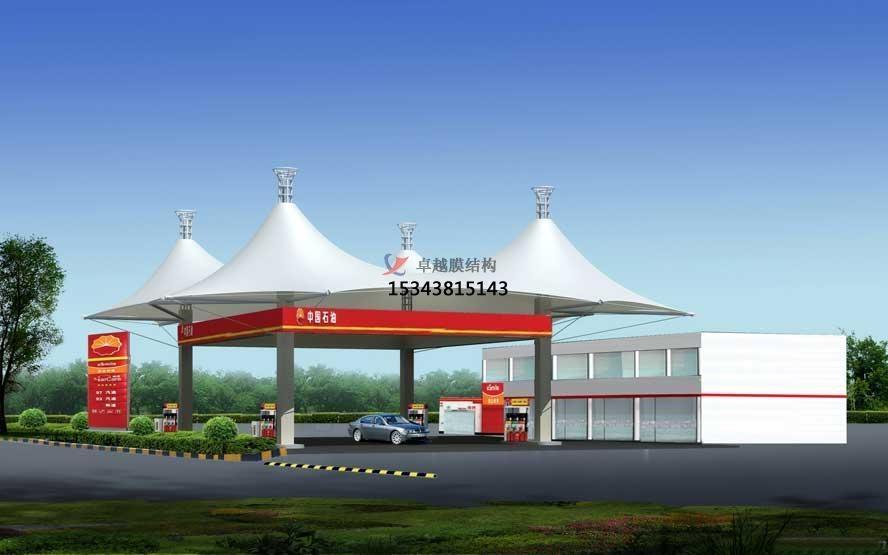 膜結(jié)構(gòu)加油站罩棚的篷布材質(zhì)是膜結(jié)構(gòu),而膜材的更大特點(diǎn)是強(qiáng)度高、耐久性好、防火難燃、自潔性好,不受紫外線影響,使用壽命長,一般15-30年。具有高透光率,透光率為13%,對熱能反射率73%,熱吸收量很少。正是因?yàn)檫@種劃時(shí)代的膜材料的發(fā)明,使膜結(jié)構(gòu)加油站罩棚成為現(xiàn)代化的永久建筑。