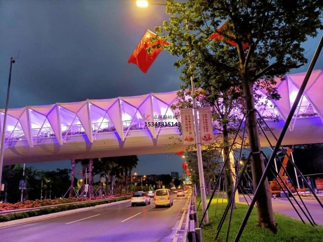 為了保質(zhì)、保量、保證工期、保安全的情況下順利的把項目交到業(yè)主手中,把施工人員分成兩班晝夜不分,日夜加班,還要克服現(xiàn)場的高溫,施工節(jié)點的困難,而且每片膜材的尺寸也不相同,為了膜材裁剪精準,設計師每跨每跨的量尺寸,又復合尺寸,確保了天橋立面膜結(jié)構(gòu)的安裝工程順利進行。