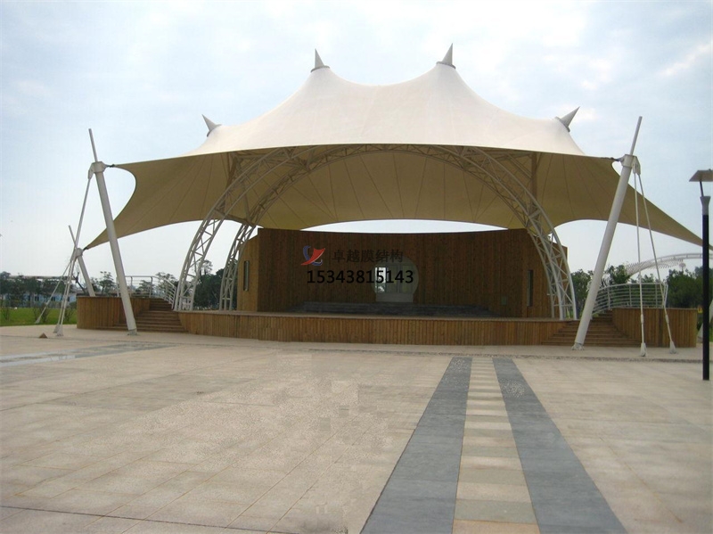 四、舞臺膜結(jié)構(gòu)具有膜結(jié)構(gòu)建筑的所有優(yōu)點:外觀雅致飄逸,空間開闊靈透、結(jié)構(gòu)輕致、透光阻燃、自潔性好、安裝快、節(jié)能降耗、造價適中、維修便捷。