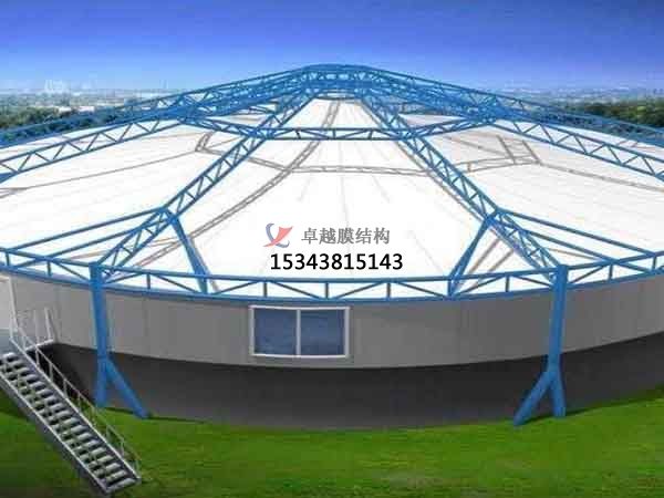2、膜結(jié)構(gòu)是目前發(fā)展很快的一種新型空間結(jié)構(gòu),是一種效率極高的張力集成體系,可以充分發(fā)揮鋼索的強度與張拉整體結(jié)構(gòu)的空間作用。它通過鋼骨架、鋼索與膜材共同受力形式穩(wěn)定曲面來覆蓋建筑空間,具有高度的形體可塑性和結(jié)構(gòu)靈活性,即通過對膜材內(nèi)部施加一定的預張力,使其具備了抵抗外荷載能力,從而充當結(jié)構(gòu)材料的一種結(jié)構(gòu)體系。我公司先后在鞍山地區(qū)承接污水池處理池膜結(jié)構(gòu)封閉的設(shè)計施工,簡介如下:
