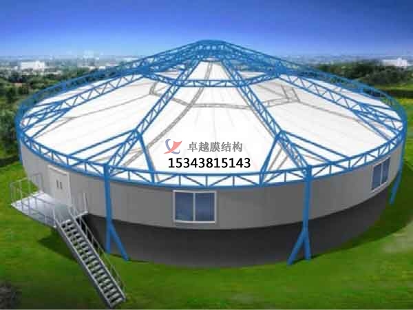2、膜結(jié)構(gòu)是目前發(fā)展很快的一種新型空間結(jié)構(gòu),是一種效率極高的張力集成體系,可以充分發(fā)揮鋼索的強(qiáng)度與張拉整體結(jié)構(gòu)的空間作用。它通過鋼骨架、鋼索與膜材共同受力形式穩(wěn)定曲面來覆蓋建筑空間,具有高度的形體可塑性和結(jié)構(gòu)靈活性,即通過對(duì)膜材內(nèi)部施加一定的預(yù)張力,使其具備了抵抗外荷載能力,從而充當(dāng)結(jié)構(gòu)材料的一種結(jié)構(gòu)體系。我公司先后在白山地區(qū)承接污水池處理池膜結(jié)構(gòu)封閉的設(shè)計(jì)施工,簡(jiǎn)介如下: