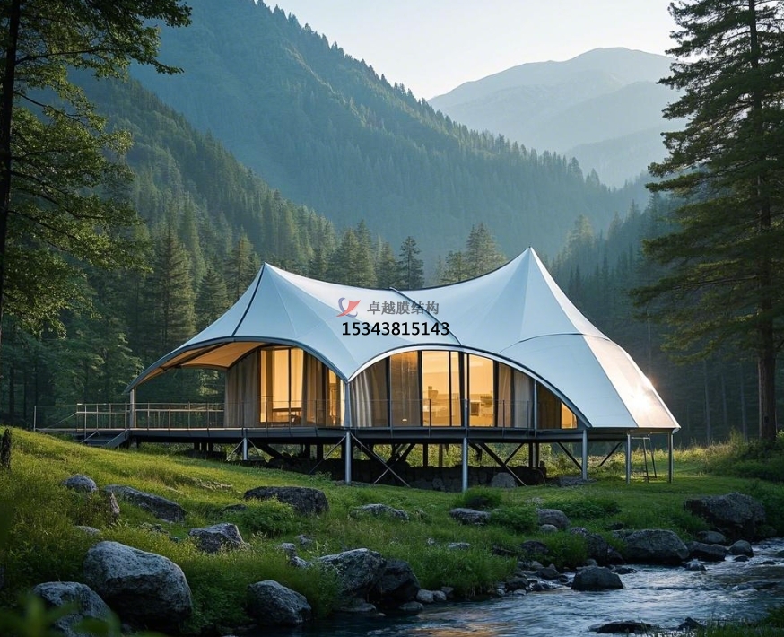 帳篷酒店膜結(jié)構(gòu)以其豐富多變的造型脫穎而出。設(shè)計靈感常來源于自然界,如白蟻巢穴、蜂巢、螢火蟲和蝸牛等生物形態(tài)。建筑師通過巧妙構(gòu)思,將這些元素融入設(shè)計,打造出方形帳篷、螺旋帳篷等獨特空間結(jié)構(gòu)。帳篷的輕盈、通透特質(zhì),與周圍自然環(huán)境完美呼應(yīng),形成一道獨特風(fēng)景線。像可見澤棲帳篷酒店,其客房 “水映螢火” 采用玻璃箱外蓋膜結(jié)構(gòu),既保證貼水居住的舒適感,又解決遮陽難題;“螺中洞天” 客房則運(yùn)用雙層膜與保溫棉結(jié)構(gòu),滿足螺旋造型需求的同時,提升內(nèi)部舒適度,從不同角度展現(xiàn)出膜結(jié)構(gòu)在美學(xué)設(shè)計上的無限可能。