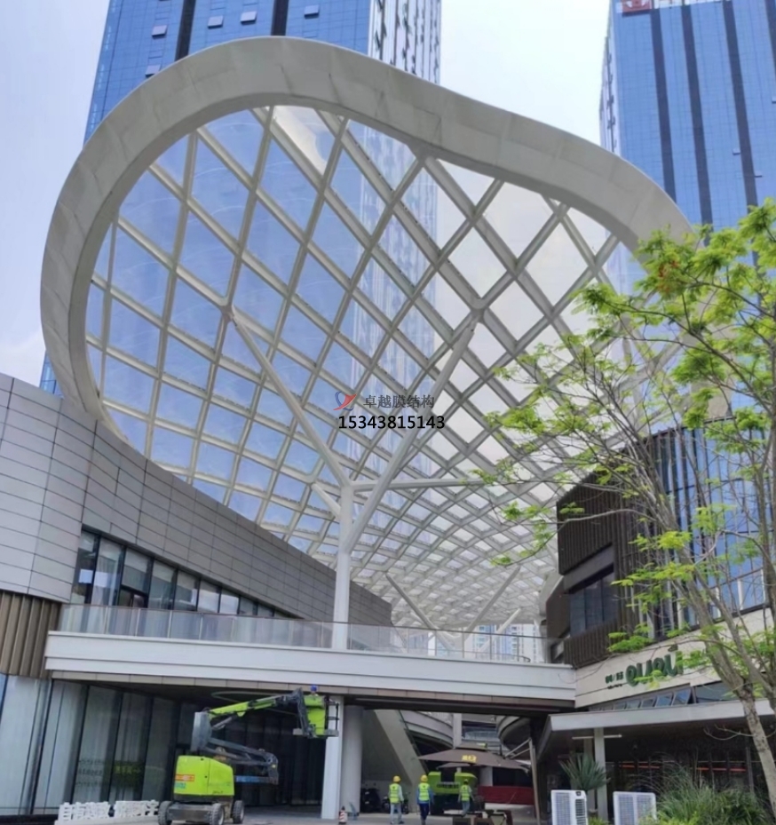 膜結(jié)構(gòu)以其獨特的輕質(zhì)材料與精妙的結(jié)構(gòu)設(shè)計,于商業(yè)街之上輕盈鋪展,仿佛是天際線下的一抹流云,既輕盈又不失穩(wěn)重。在步行街的穹頂之下,膜結(jié)構(gòu)以其柔和的曲線與透光的材質(zhì),巧妙地界定了空間,同時讓自然光與人工照明交織成一幅流動的光影畫卷,為購物者營造出一處既私密又開放的夢幻之境。