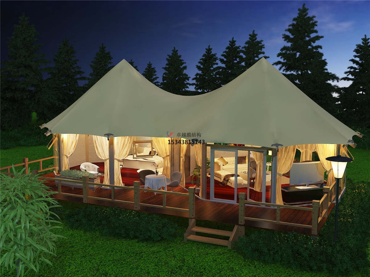 另外由于膜材料本身特有的顯色性,在夜間彩燈的映射下能形成絢麗繽紛的景觀。不僅為人們提供遮陽(yáng)避雨的空間。同時(shí),更由于這種生動(dòng)活潑的造型能給人們帶來時(shí)尚、輕松的休閑感受,所以廣受歡迎。