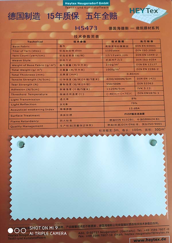 II. HeytexH5573建筑膜材為新一代可焊式PVDF復(fù)合材料,雙面PVDF涂層,直接焊接,10年質(zhì)保。