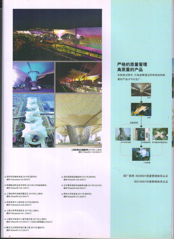 SHEERFILL產(chǎn)品能夠在-70C到+230C的溫度范團內(nèi)安全使用。具有良好的耐熱性、耐濕性、耐藥品性等特性,即使在承受了暴風(fēng)雪這類惡劣天氣后,膜結(jié)構(gòu)仍然能維持初始狀態(tài),膜材料不會產(chǎn)生松弛。